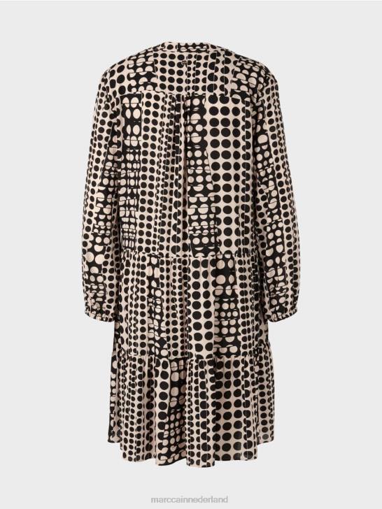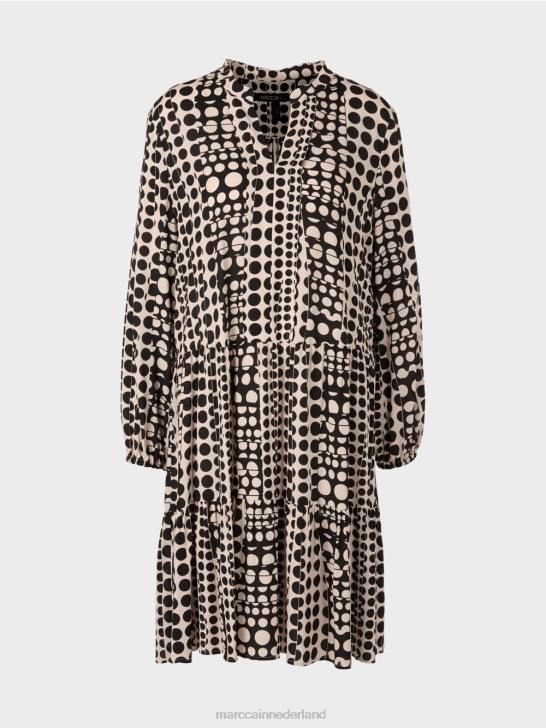 deze jurk heeft een op-art patroon en is gesneden in de stijl van de jaren 70. de losheid van het lijfje geeft het een eigentijdse uitstraling, samen met de combinatie van details zoals de opstaande kraag, biezen en gelaagde rok. de mouwboord is voorzien van een elastische bies.