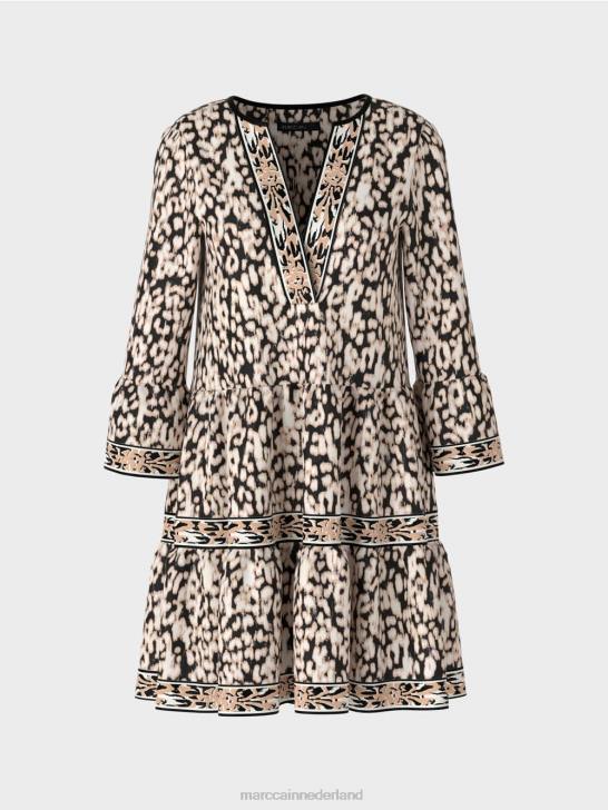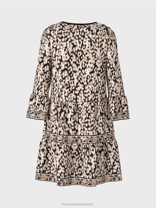 losvallende jurk met een swingrok en een abstracte all-over luipaardprint. deze luipaardjurk is gemaakt van een comfortabele jerseystof. de lange trompetmouwen, de randen van de halslijn en de rok zijn voorzien van geprinte strepen die zelf versierd zijn met geprinte biezen.