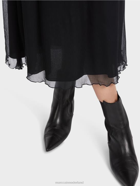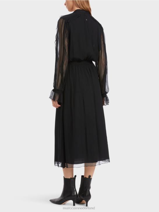 zacht gedrapeerde viscose jurk van crinkle chiffon. ruches aan de mouwen, halslijn en schouderpartij geven deze licht transparante midi-jurk een speelse look. het ontwerp wordt aangevuld met een casual kraag met lus. de gesmokte taille zorgt voor een vrouwelijk silhouet. Ook de manchetten van de mouwen zijn voorzien van een gesmokte inzet.