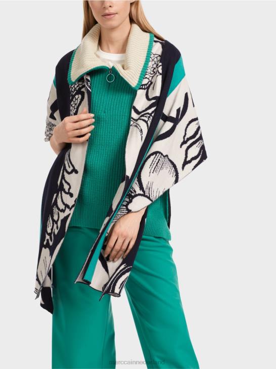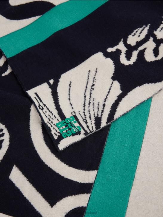 de gebreide sjaal is gemaakt van een elegante vezel met kasjmiergehalte. het collage-achtige ontwerp bevat fragmenten van Marc Cain-letters en Aziatisch geïnspireerde tattoo-motieven. het artikel draagt het duurzaamheidslabel ‘samen heroverwegen’.
