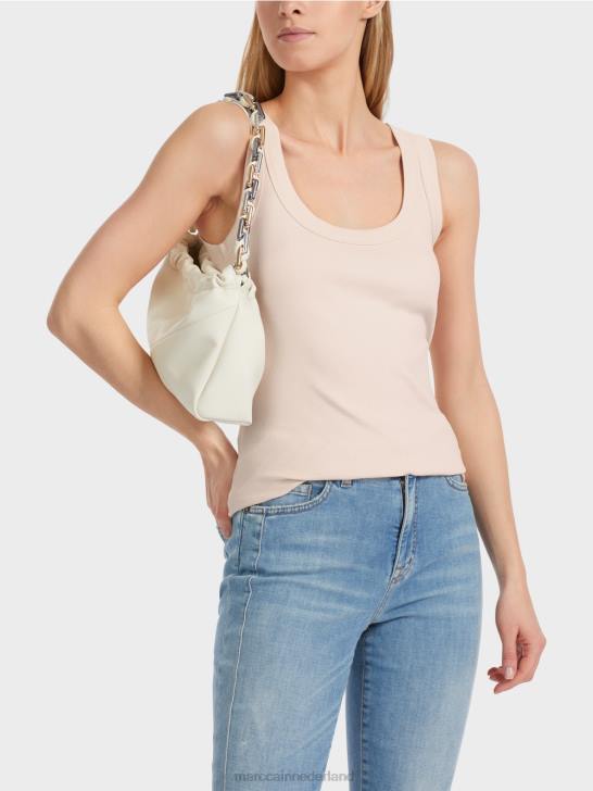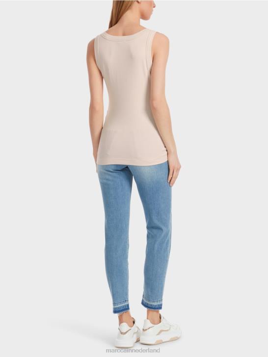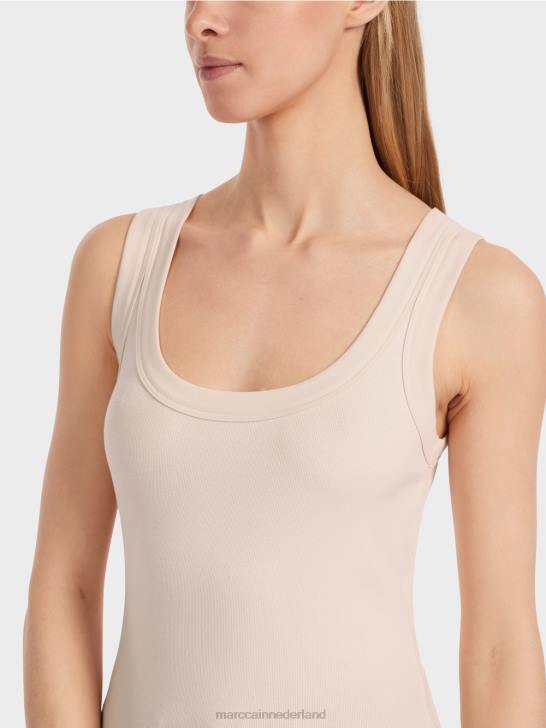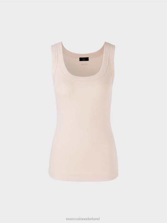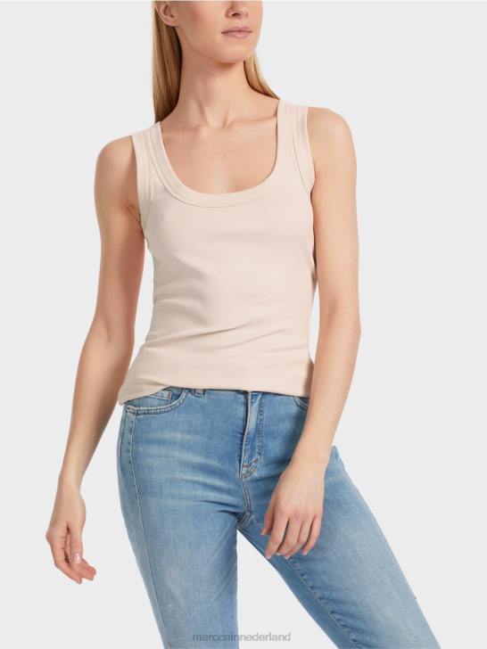de top is gemaakt van soepel katoenen rib. de snit is slank en jersey-vormig. de ronde halslijn is relatief diep en breed. opvallend: de brede rand bij de halslijn en armsgaten.