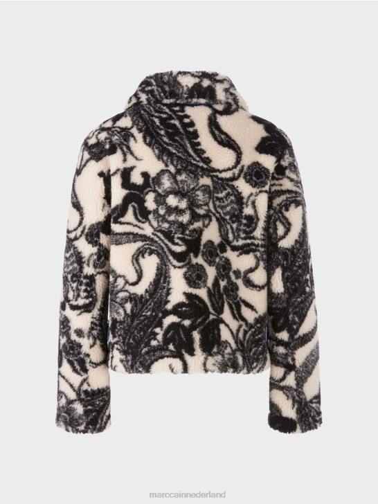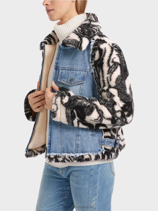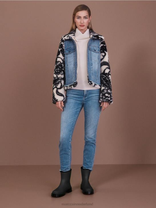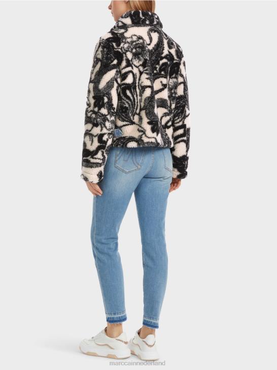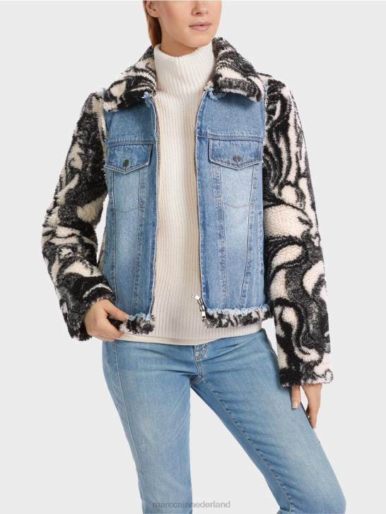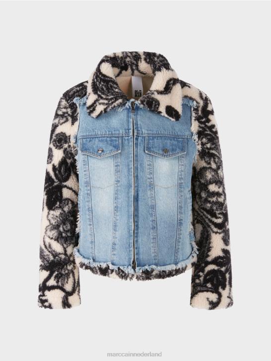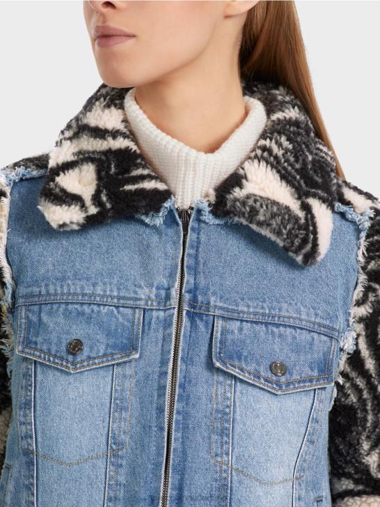 dit pluchen jack met patroon heeft een voorkant van gebruikte denim. het denimgedeelte heeft gerafelde randen en daardoor ziet het jasje eruit alsof het in diy (doe-het-zelf) is herwerkt. het pluche is voornamelijk gerecycled polyester. het ontwerp doet denken aan mystieke tattoo-motieven. de zoombreedte kan aan de zijkant worden verkleind met een riemachtige stoffen band.