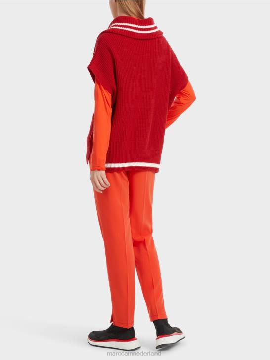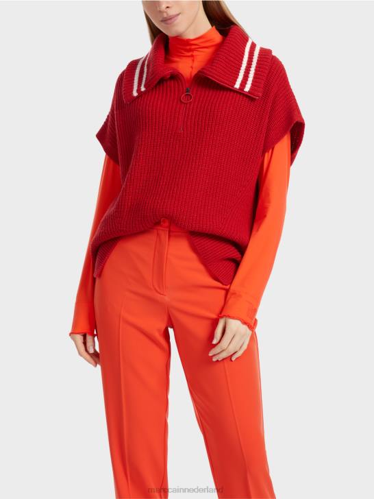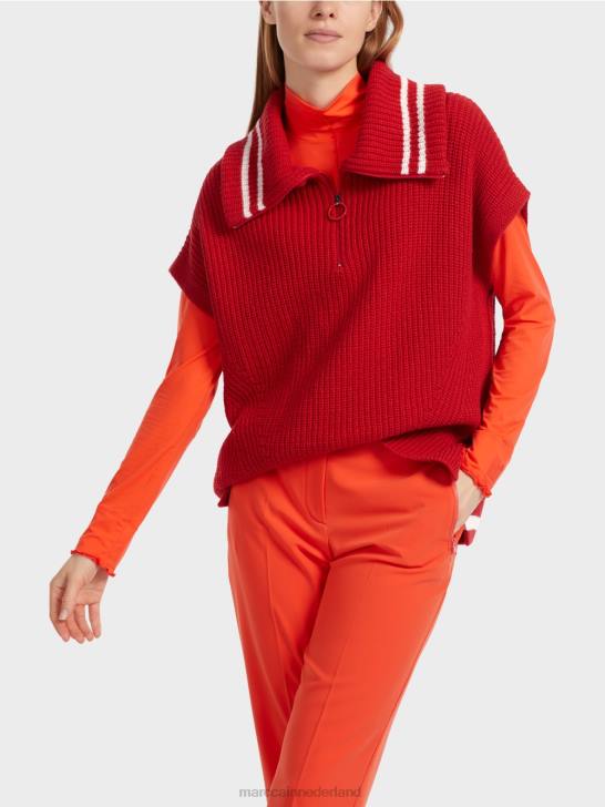 de mouwloze trui is gemaakt van een elegant garen met viscose- en kasjmiergehalte. Het centrale designkenmerk is de grote kraag, die via de ritssluiting kan worden gevarieerd. het artikel is gebreid in Duitsland: het is gebreid en verfraaid in Duitsland met behulp van de nieuwste technologieën. de afzonderlijke delen, zoals de rug en mouwen enz., worden in Europese partnerbedrijven aan elkaar genaaid.