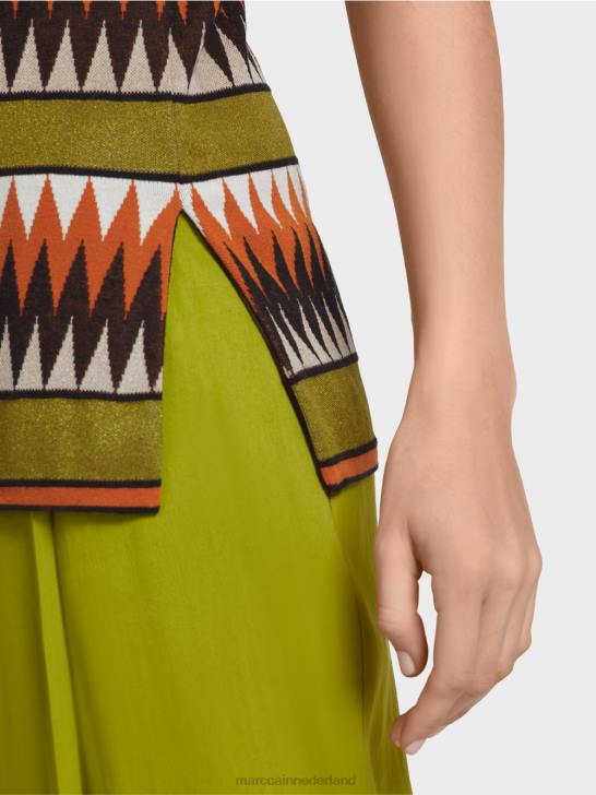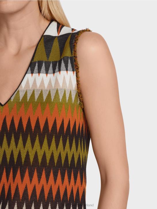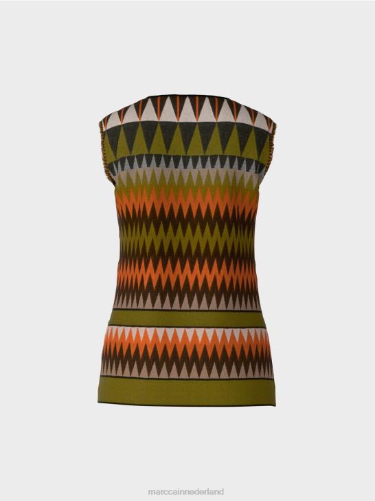 het ontwerp van deze mouwloze gebreide trui wordt bepaald door een diepe v-hals en splitten aan de zijkant naad. de intense seventies kleuren en het zigzagpatroon zorgen voor een levendige look, versterkt door stoere franjes aan de armsgaten. de trui wordt gebreid en afgewerkt in ons bedrijf in Duitsland. de verdere verwerking van de afzonderlijke stukken wordt uitgevoerd door onze partnerbedrijven in Europa. dit maakt het artikel "gebreid in Duitsland".