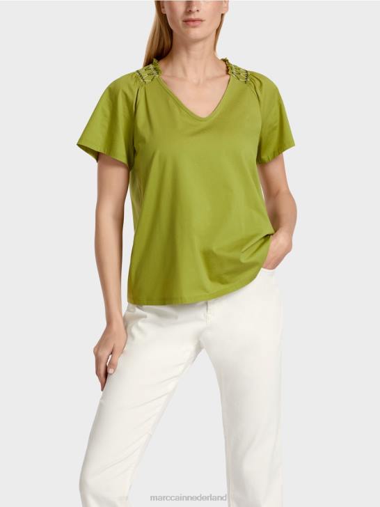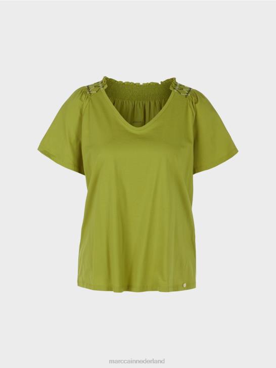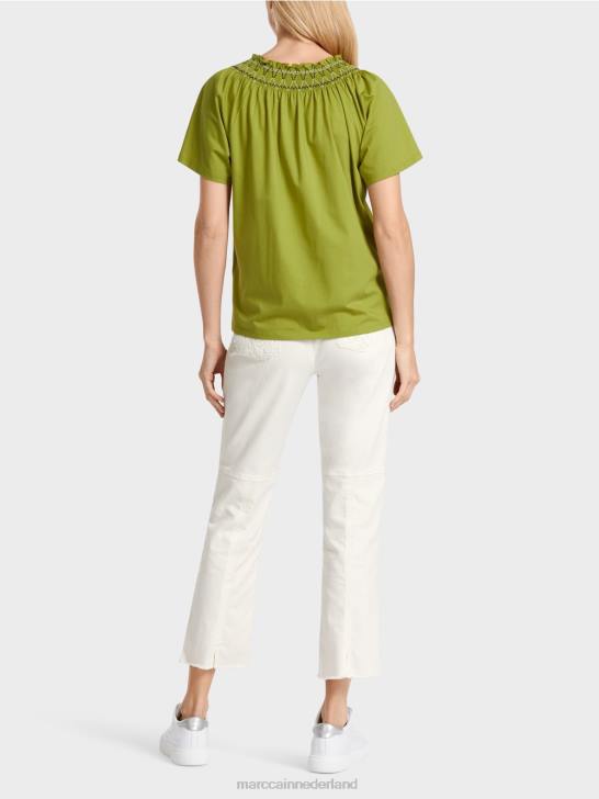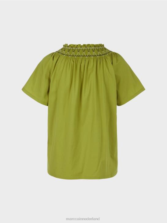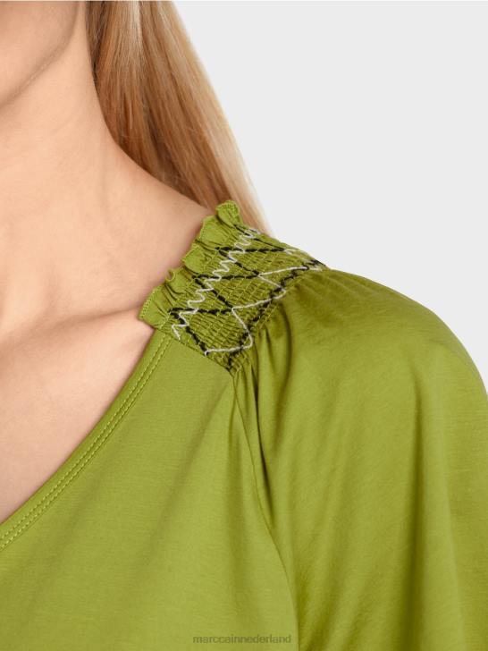 de breedte van de top kan aangepast worden door de plooitjes bij de halslijn. de elastische mouwzoom is geïnspireerd op traditionele vakmanschapstechnieken en ziet eruit als een geborduurde rand. het zachte materiaal geeft de top zijn figuuraccentuerende stijl.