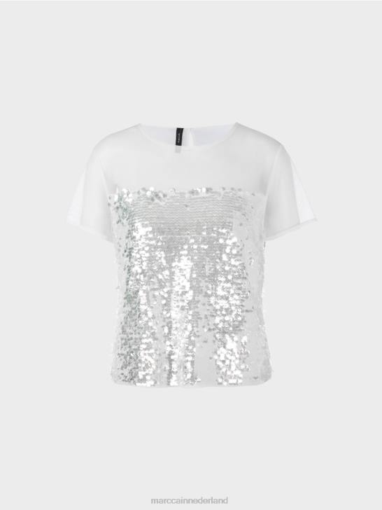 deze top is geheel versierd met pailletten. de schouders en mouwen zijn gemaakt van een doorzichtige stof waardoor een opvallend contrast ontstaat. de top sluit aan de achterkant met een knoopje.
