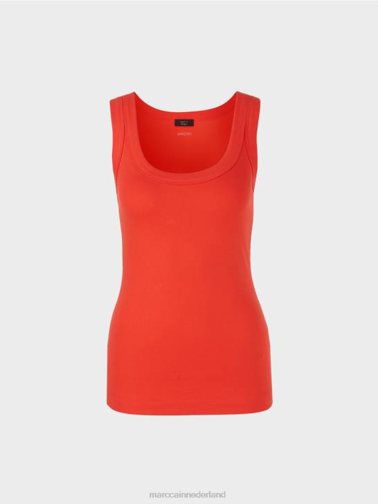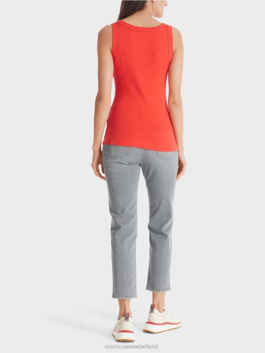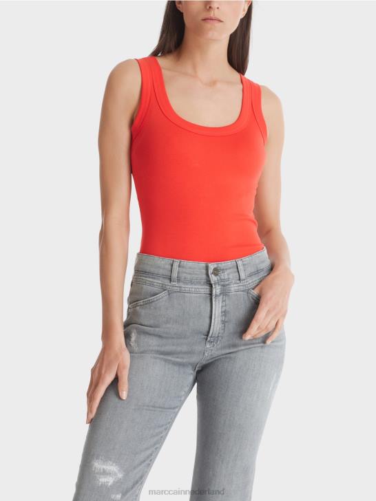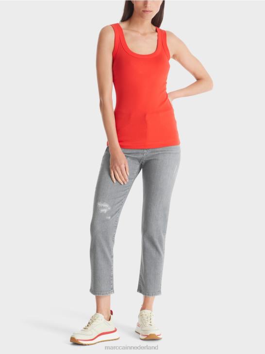 strakke tanktop van katoen met een comfortabel extra spandex-element en een ronde hals uitsnede door Marc Cain. het aansluitende silhouet combineert in dit easy-going basic item met een uiterst fijn geribd dessin. een relaxed must-have item, dat een vleugje nonchalance aan elke garderobe toevoegt.