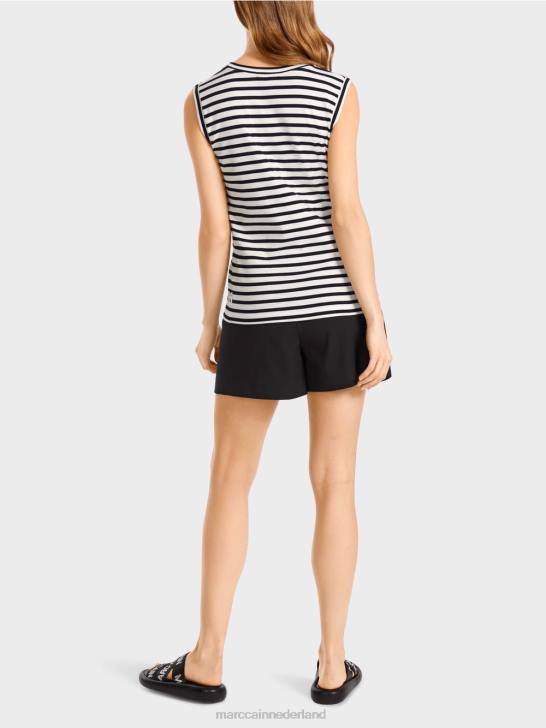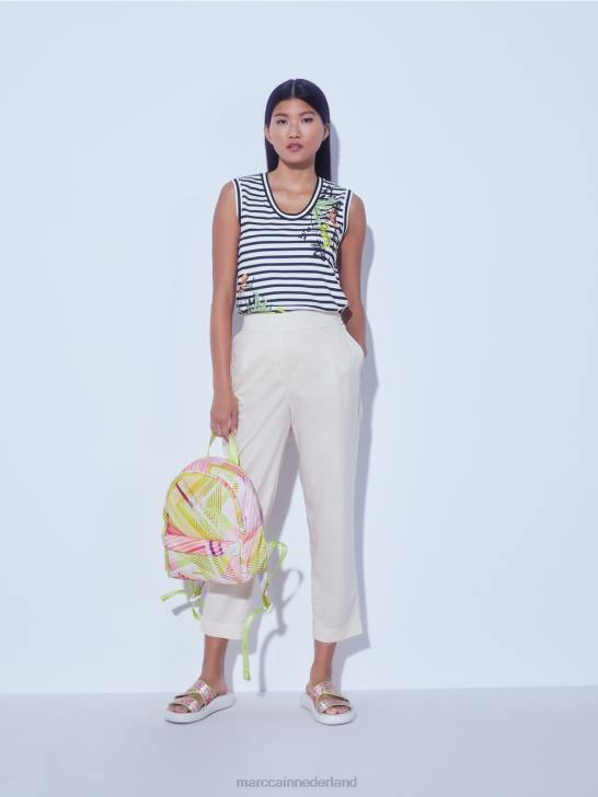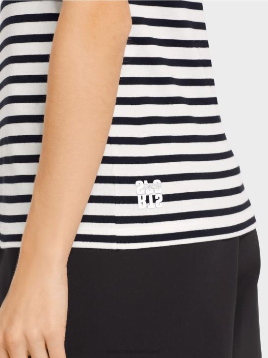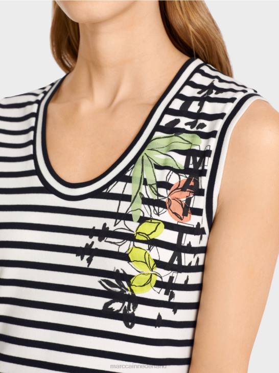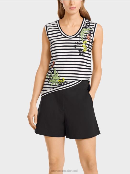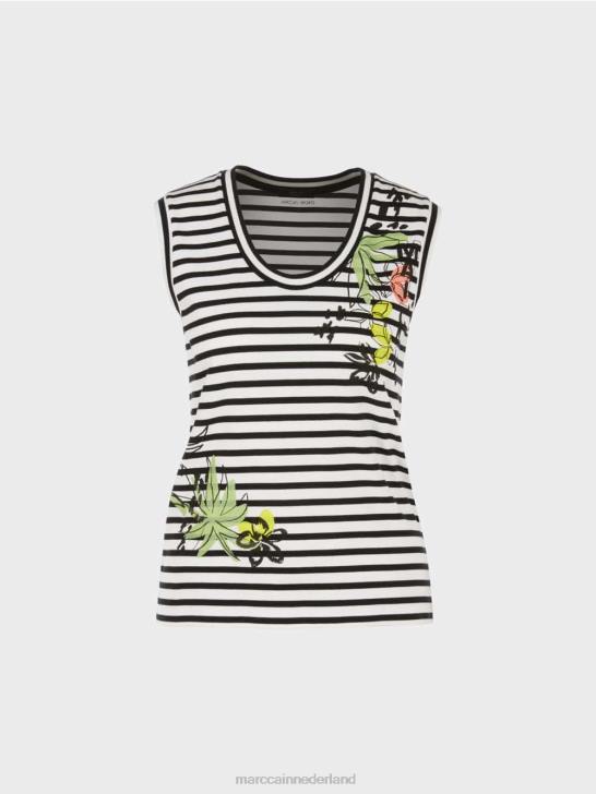 nauwsluitende top van stretchkatoen. de nautische stijl van deze gestreepte top krijgt een vrouwelijk tintje door de bloemenprint. de brede ronde hals en armsgaten zijn afgezet met gestreepte tape.