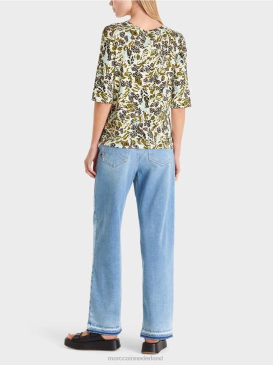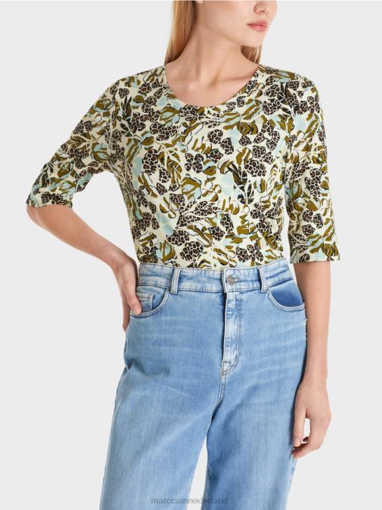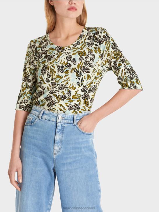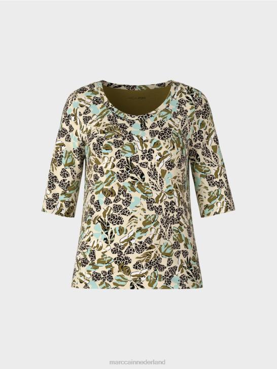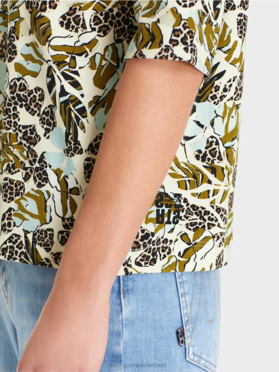bedrukt met bladeren en leo, dit shirt biedt het beste draagcomfort dankzij de stretch katoenkwaliteit. het model heeft een geribbeld design en een ronde halslijn. halflange mouwen maken het ontwerp compleet.