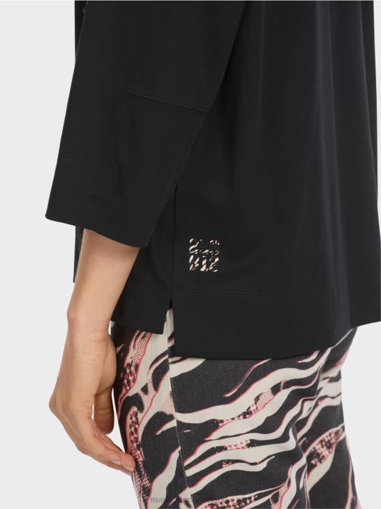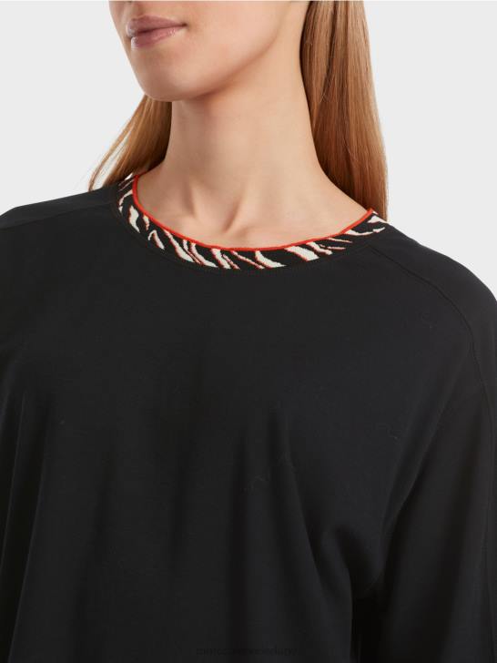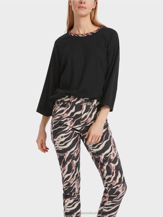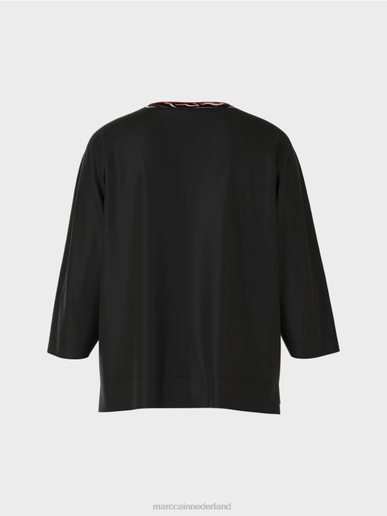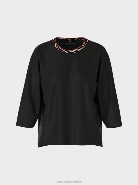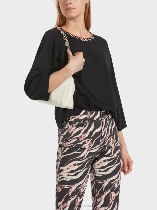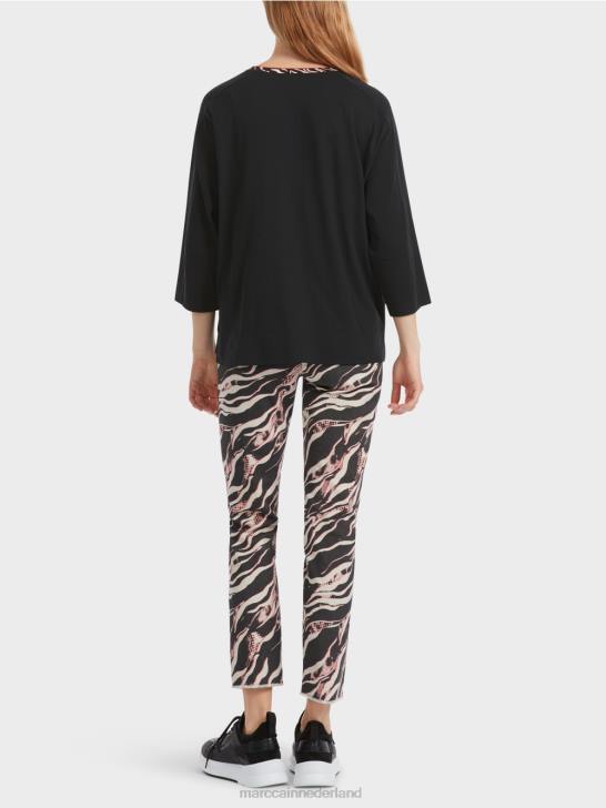 het t-shirt is gemaakt van zacht katoen. de slimme mouwconstructie zorgt voor een smalle schouder en een casual wijde body. er zitten kleine zijsplitjes in de zoom. de achterkant is iets langer gesneden. de opvallende halslijn is afgezet met een patroonbreisel.
