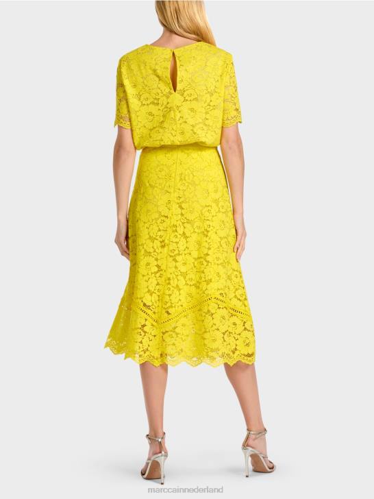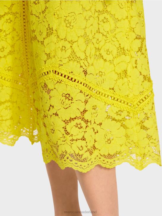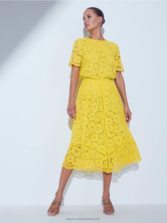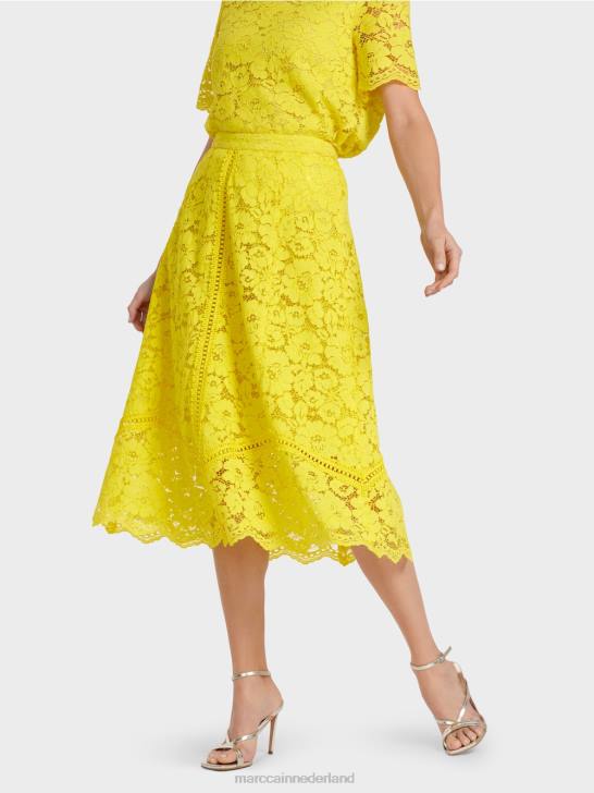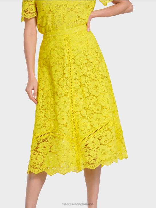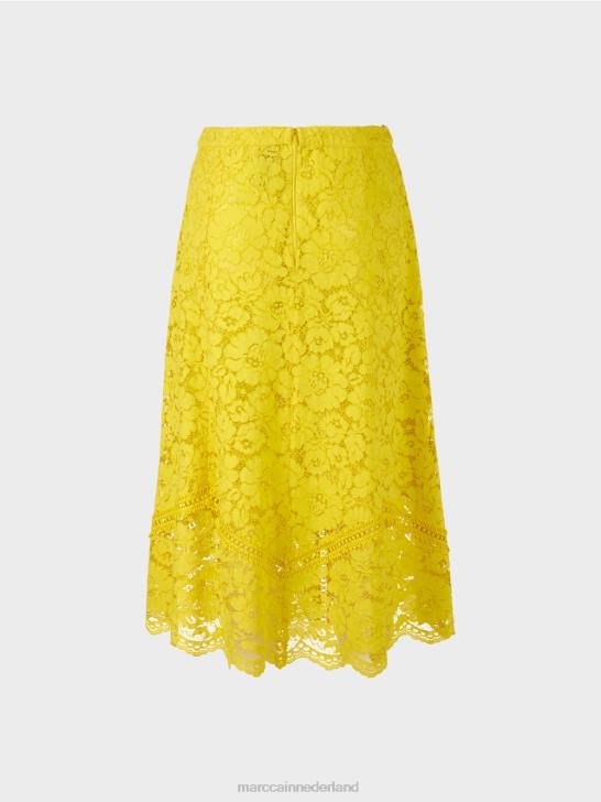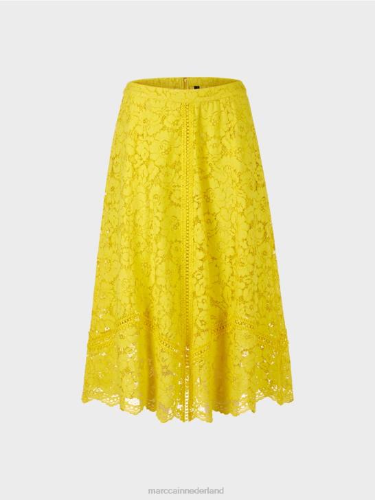 deze rok is klassiek afgewerkt met een tailleband en ritssluiting. de brede, zwierige vorm is gecreëerd in panelen met contrasterende kant geïntegreerd in de naden. hierdoor wordt de uitsnede onderdeel van het ontwerp. de voering is gedeeltelijk en de zoom is doorzichtig.