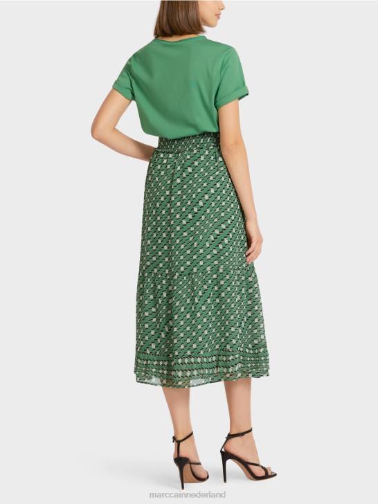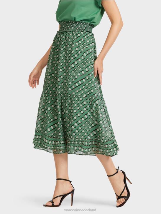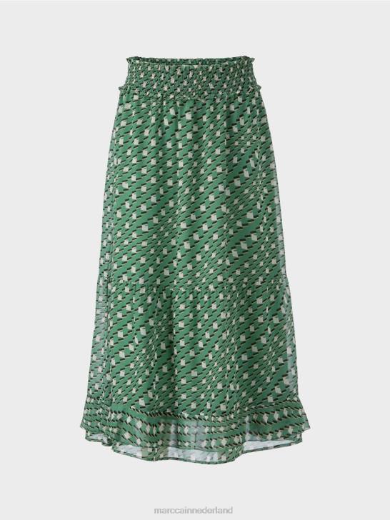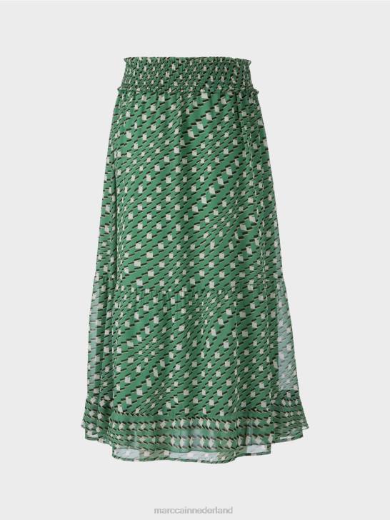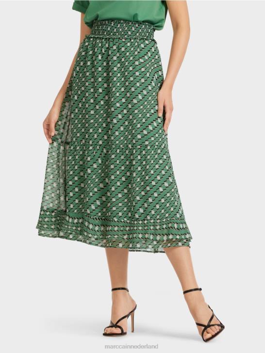 speelse midirok met geometrische print en gelaagde volants. deze rok straalt vrouwelijkheid uit met ruches en een gesmokte taille. het belooft uitstekend comfort dankzij het a-lijnsilhouet en de hoge elastische tailleband. het fantasierijke, geometrische ontwerp voegt een speciaal tintje toe.