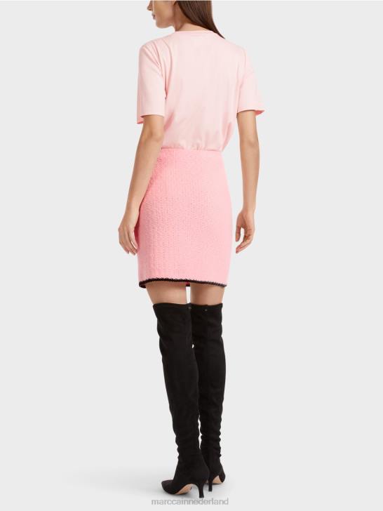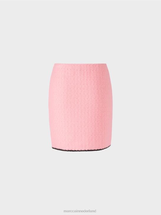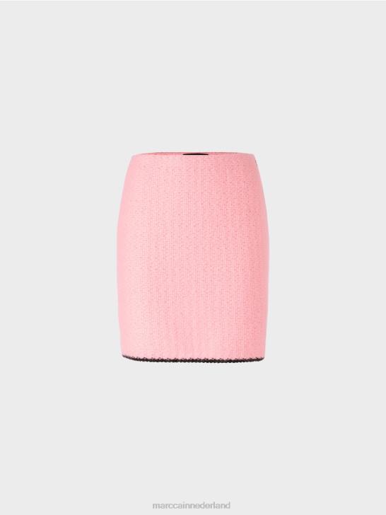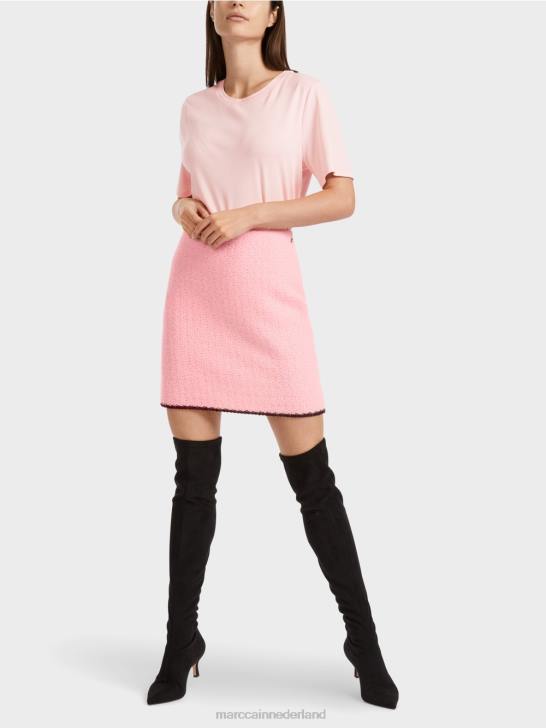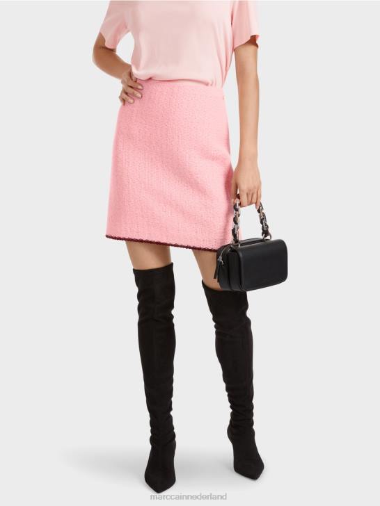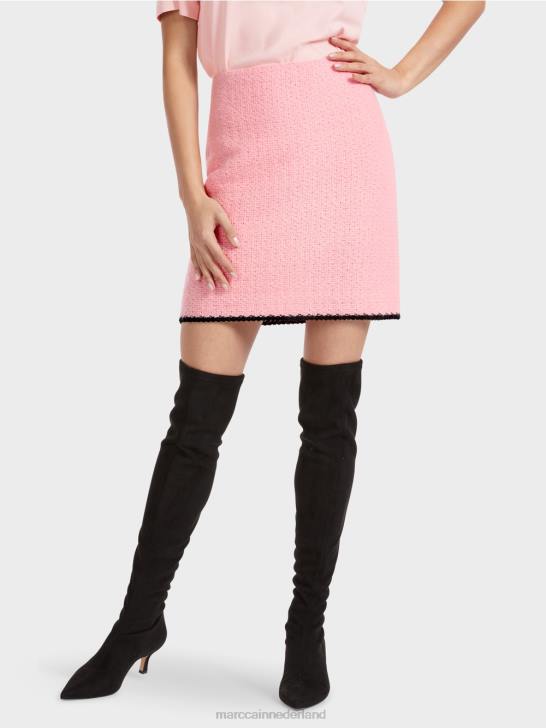 nauwsluitende minirok met contrasterende strepen aan de zoom. Deze gevoerde minirok is gebreid uit een materiaalmix met alpaca, wol, mohair en katoen en is dus "gebreid in Duitsland": het breien van de garens op ultramoderne breimachines en de afwerking van de stoffen gebeurt in Duitsland. de afzonderlijke onderdelen, zoals mouwen, voorpand enz., worden in Europese partnerbedrijven aan elkaar genaaid.