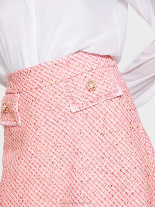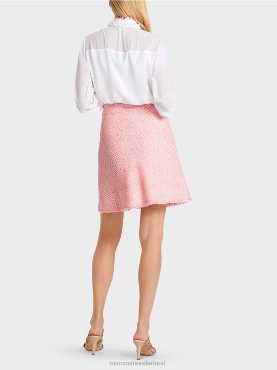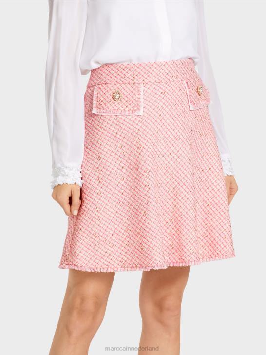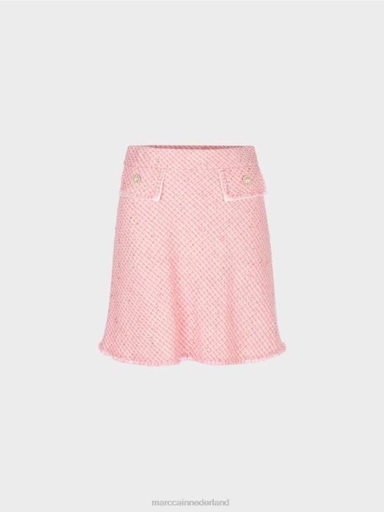 deze uitlopende minirok is een verwijzing naar de jaren zestig, toen de minilengte voor het eerst in de mode kwam. het boucle-achtige materiaal wordt geaccentueerd door een glinsterende draad. een decoratieve knoop op de nep-klepzakken past hier perfect bij. de flappen zijn omzoomd en bedekt met een ultrafijne stof. Ook aan de zoom zijn franjes te vinden. de rok is gevoerd voor een perfecte pasvorm.