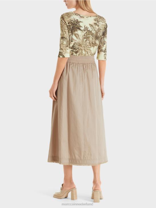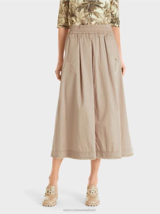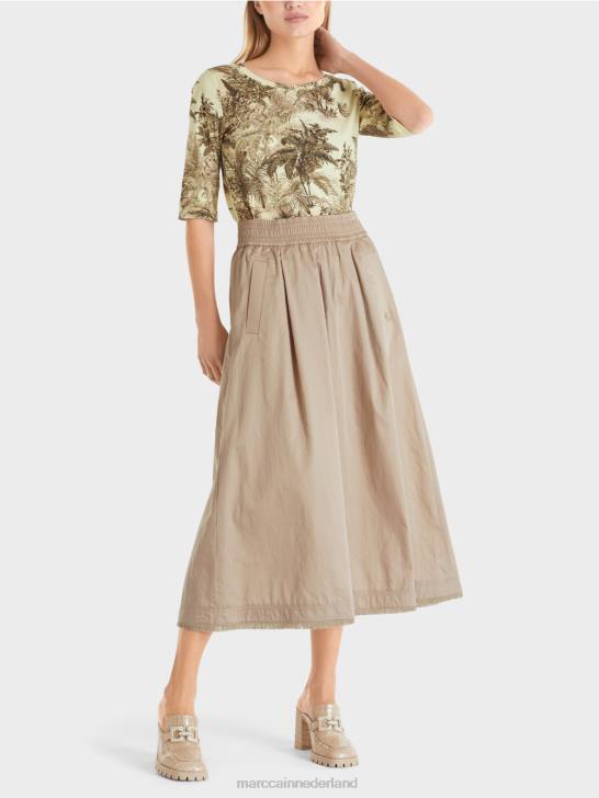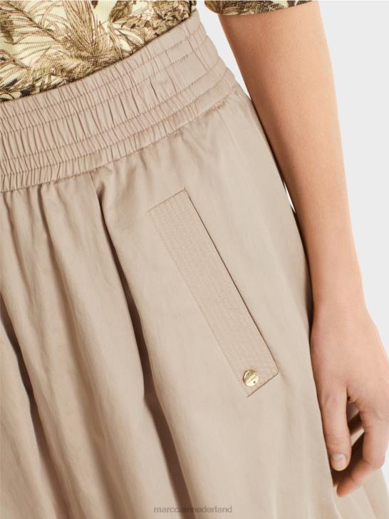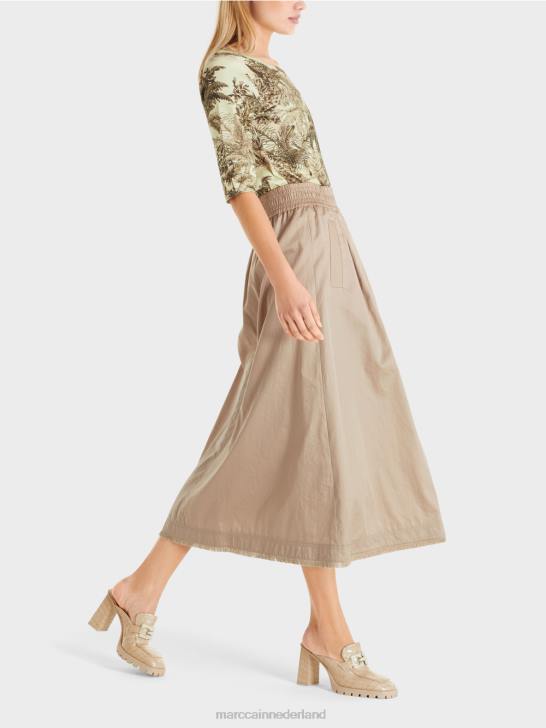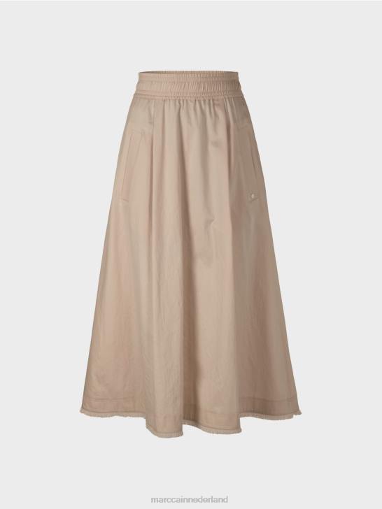 de kuitlange rok heeft een joggingband en loopt uit naar de zoom toe. de zoomrand is voorzien van subtiele franjes. het beschikt over opvallende paspelzakken met naadeffecten. de rok is elegant en toch gemakkelijk te dragen en te combineren.