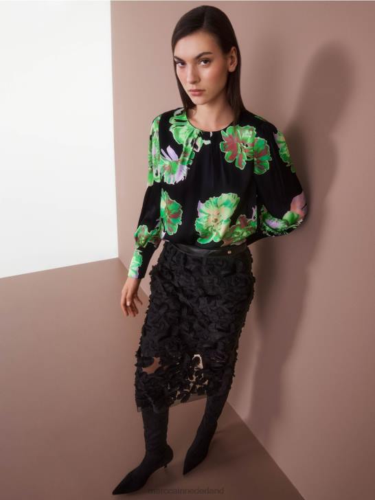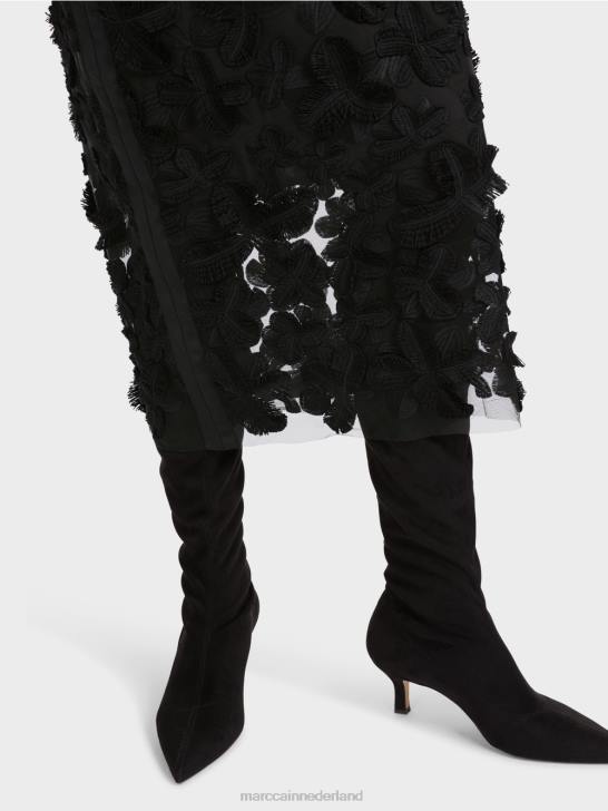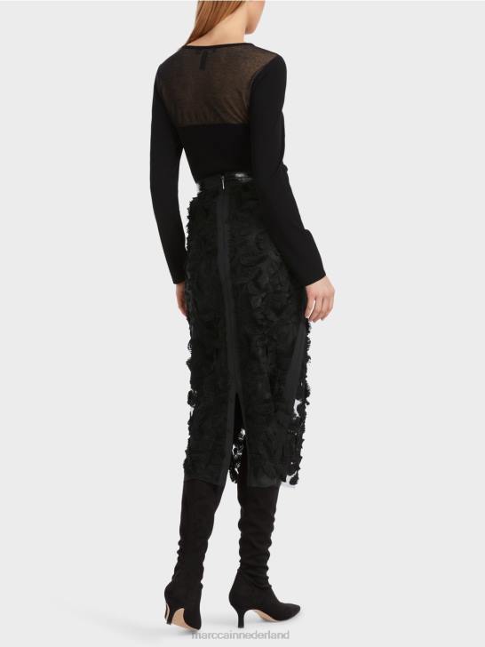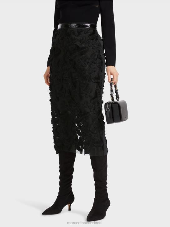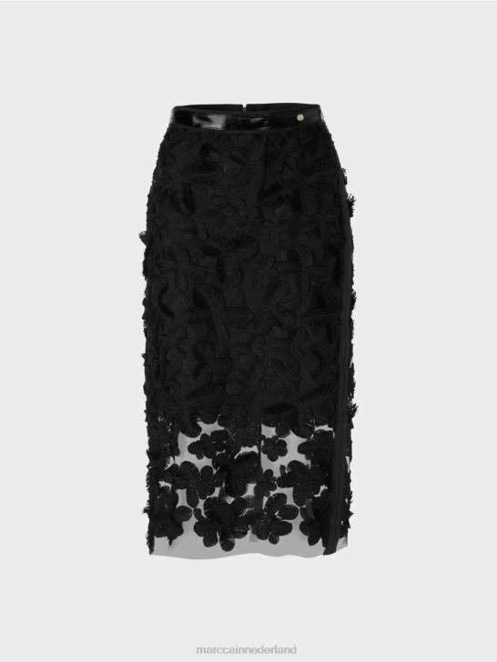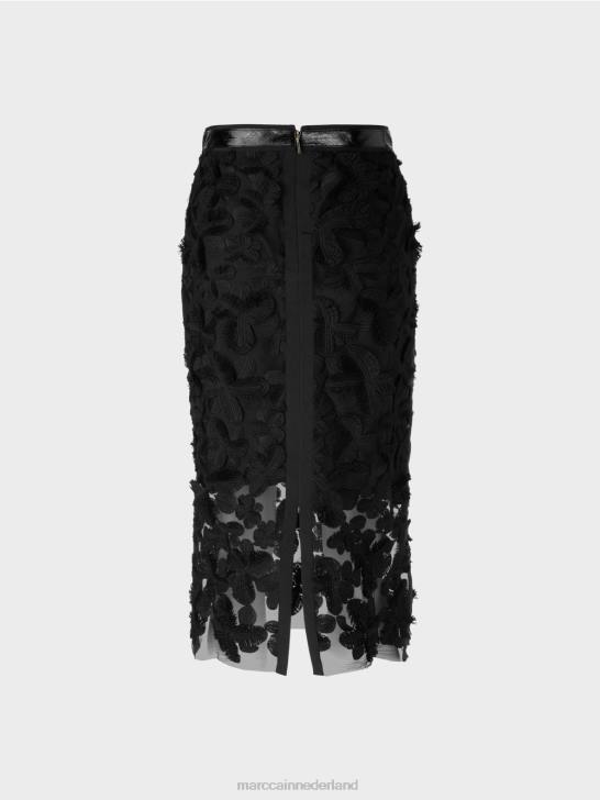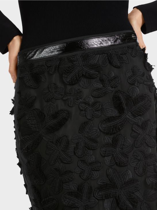 midirok in nauwsluitende snit van zacht vallend tule kant. deze rok heeft een elegant bloemendessin. het doorschijnende materiaal geeft het zijn bijzondere karakter. Het wordt geleverd met een split aan de achterkant en een verborgen ritssluiting.