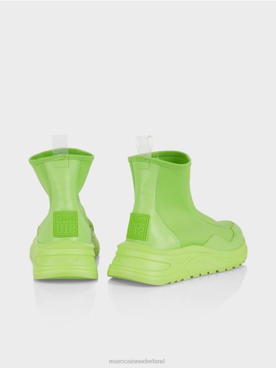 de casual halfhoge sneaker heeft een opvallende uitlopende zool in een lage wigvorm. het heeft een praktische instapvorm met een taps toelopend bovenwerk. Dankzij het elastaanaandeel en het extra bandje is hij gemakkelijk aan en uit te trekken. de profielzool met een leeuwenkop in reliëf en Marc Cain-letters zijn een prachtig detail.