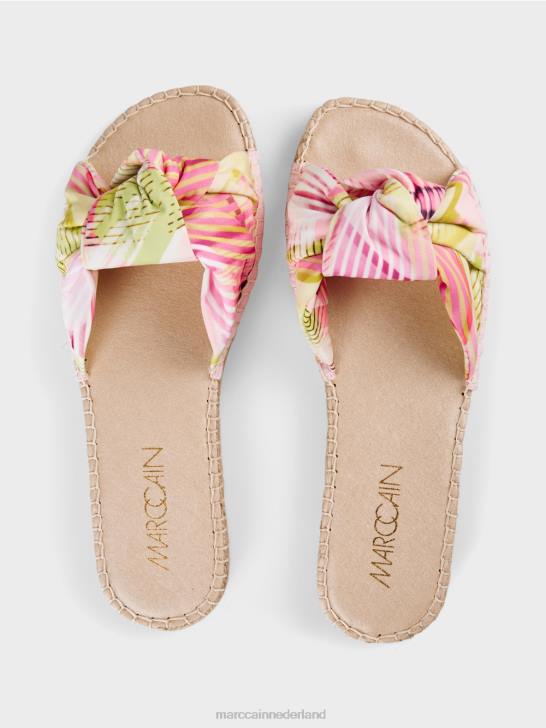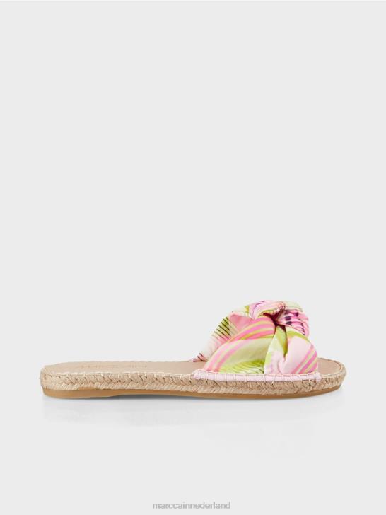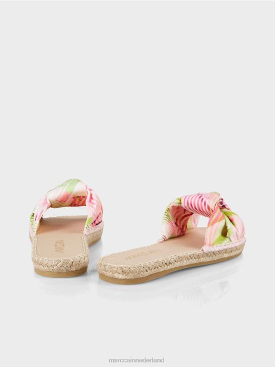 platte sandalen met een afgeronde buitenlijn. Deze sandalen hebben een kleurrijke geknoopte band van bedrukte stof. de afgeronde buitenzool ziet er liefdevol met de hand gestikt uit. de sandalen zijn zeer comfortabel om te dragen dankzij het zachte voetbed.