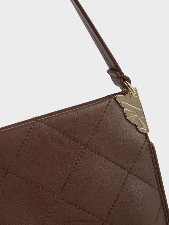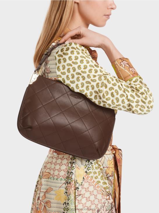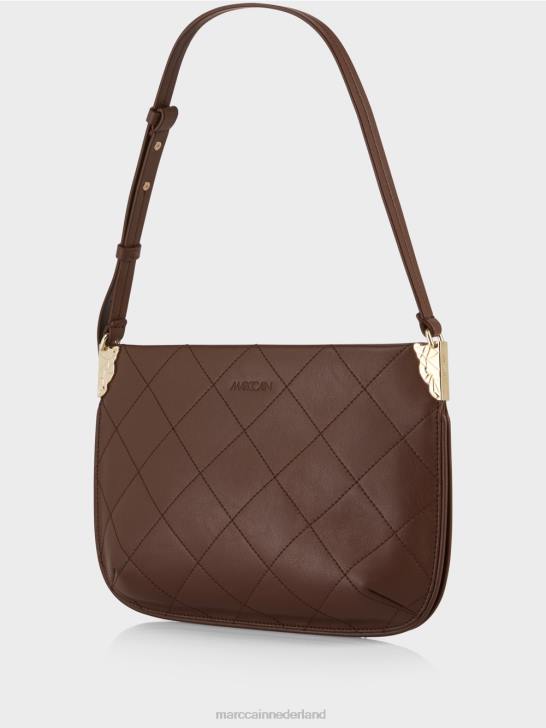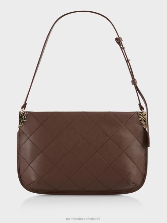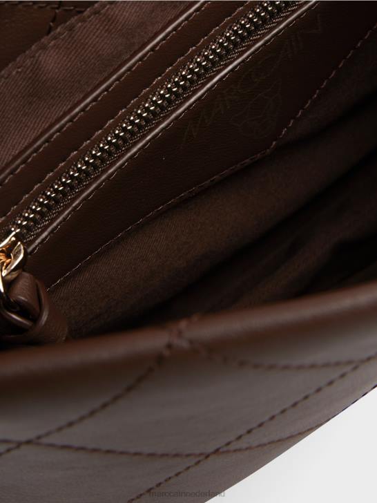 de schoudertas is grotendeels gemaakt van gerecycled leer en draagt het duurzaamheidslabel "rethink Together". door het diagonale quilten en de verwerking ervan heeft het een relatief statische vorm. dit laatste wordt bereikt door de figuurnaden en de diepe plooi in de bodem. Decoratieve details zijn onder meer de metalen bevestigingen waaraan de schouderband is bevestigd. De tas is gevoerd en heeft een binnenvak met ritssluiting.