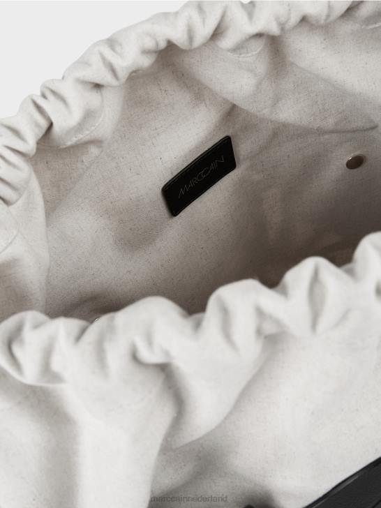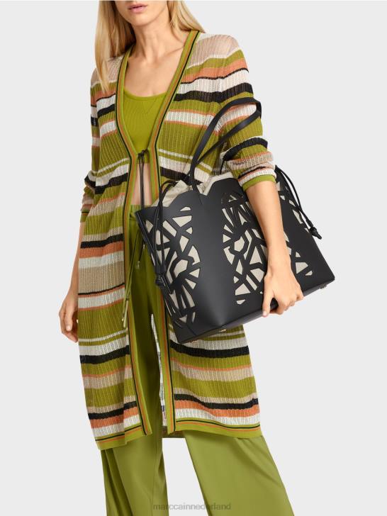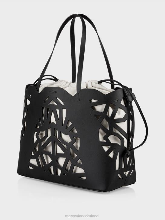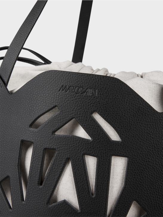 tweekleurige draagtas van het duurzaamheidslabel "rethink Together" met leer en katoen. deze tote bag krijgt zijn kenmerkende stijl door de speelse uitsparingen met luipaardkop-look. vooral omdat het als het ware twee tassen in één biedt. de binnenkant bestaat uit een katoenen tas met koordsluiting en is afneembaar met een drukknoop. het biedt voldoende ruimte om te winkelen.