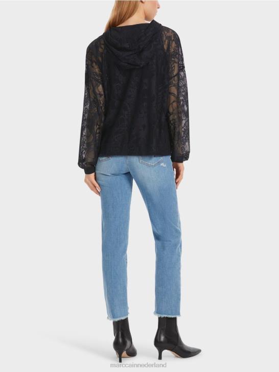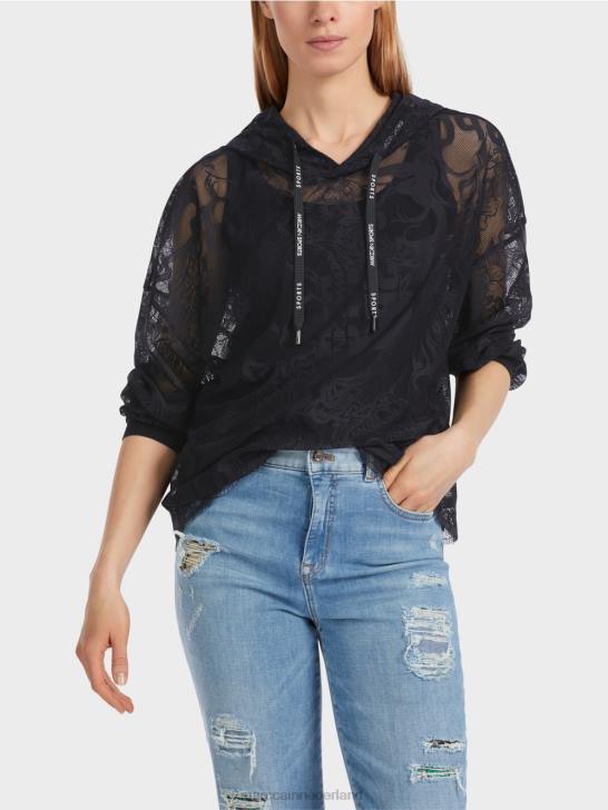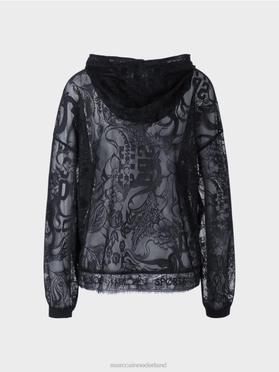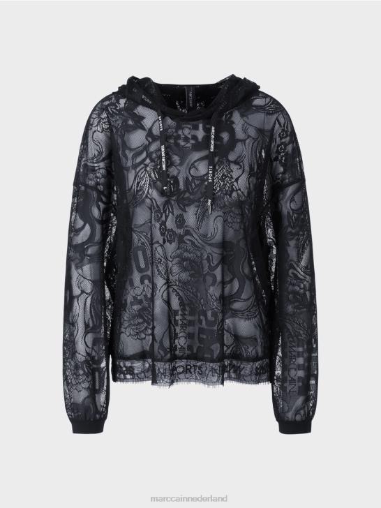het sweatshirt is gemaakt van tule kant. het motief is geïnspireerd op mystieke tatoeages en toont met elkaar verweven bloemen en draakachtige wezens. de zoom is voorzien van een delicate kanten rand versierd met Marc Cain-letters. de mouwen zijn vastgemaakt met een geribde manchet.