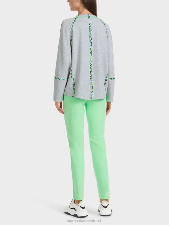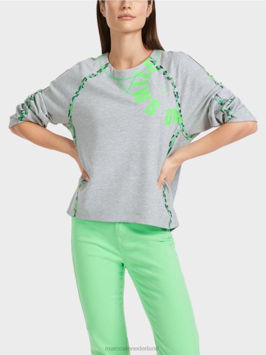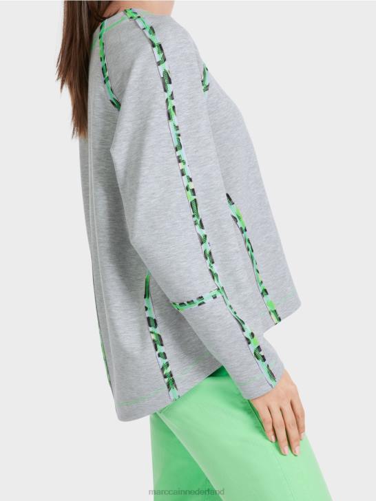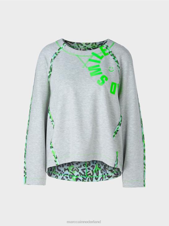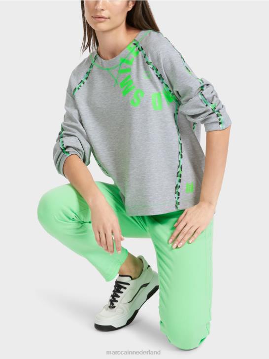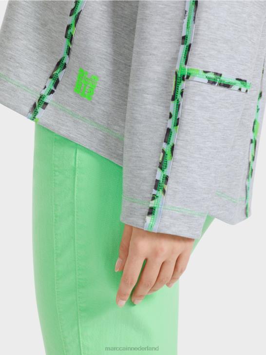 het sweatshirt is gemaakt van dubbelzijdig materiaal met een buitenspelpatroon. Omdat de naden aan de buitenkant zitten, is de buitenzijde met patroon zichtbaar in de naadtoeslag. het onconventionele naadontwerp - de zijnaden zijn naar voren verschoven - zorgt voor een cool deconstructie-effect. de fluorkleur uit het all-over design komt terug in de naden en in de asymmetrisch geplaatste print aan de voorkant. de achterzoom is afgerond.